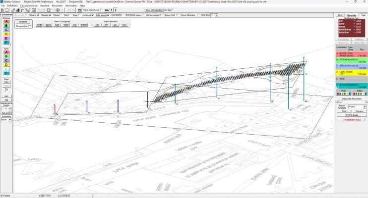 The slope of the road would have a significant impact on the horizontal illuminance, which is where the Lighting Reality Pro feature to creating sloping grids would allow this to be modelled. Although I had few previous opportunities to use sloping grids, they proved relatively simple in Lighting Reality, and I had more trouble trying to establish the gradient of the slope finally resorting to information provided from cycle clubs who were mad enough to try riding up it. After setting up the grids, I could then explore options to achieving a compliant solution.